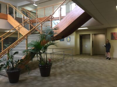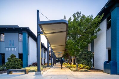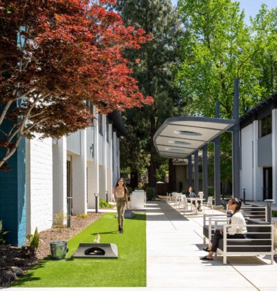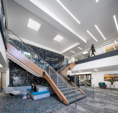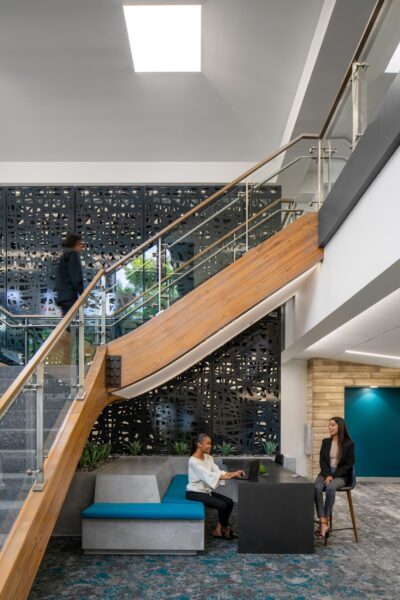 Each building’s lobby, restrooms, and elevators were renovated to include new finishes, lighting and code related signage. Facade treatments to the exterior bring a refreshed, new look to central entry areas leading to the lobbies. Improvement to the lobbies include new tenant entries, central mailbox area, and drinking fountain alcove, with new feature walls behind the existing central stairs. Restroom upgrades include new partitions and plumbing fixtures.