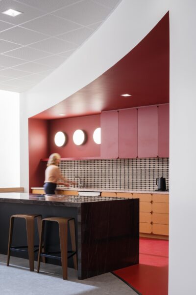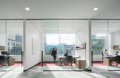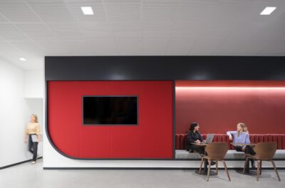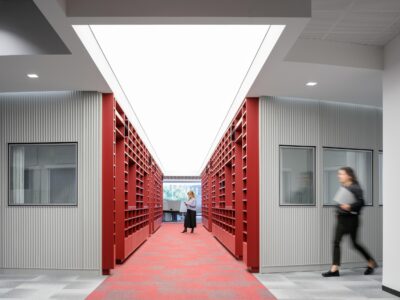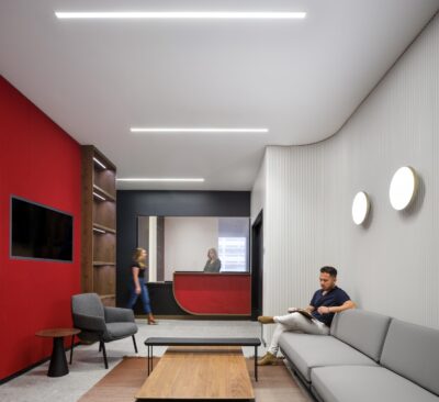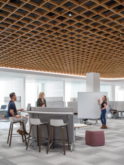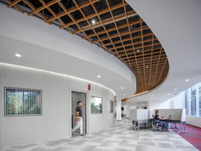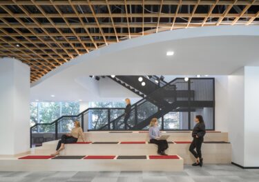 The renovation introduced a versatile mix of environments, including private but transparent offices, collaborative areas, and tiered bleacher seating designed to inspire connection and creativity.