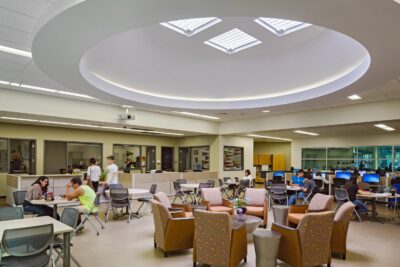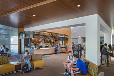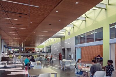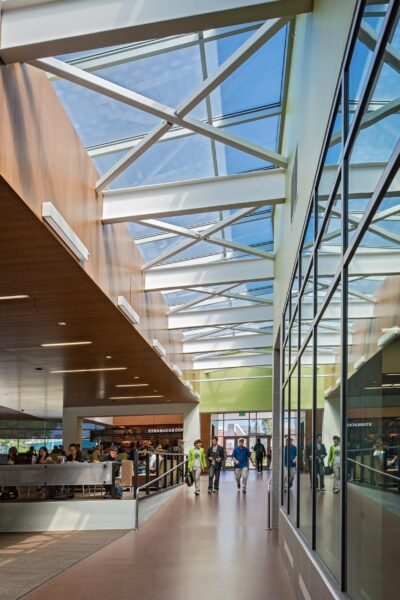 A central meeting place for students, faculty, and the community, it is a destination that connects the campus’ network of exterior spaces, creating a focal point for student activity. The 50,000 square foot center includes the International Center, student lounge and activity space, dining and food services, campus meeting center, Campus Life & Government Center, Campus Community and Diversity Resource Center, e-services and outdoor activities.