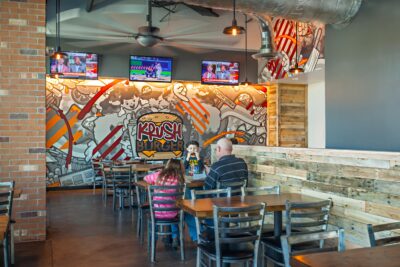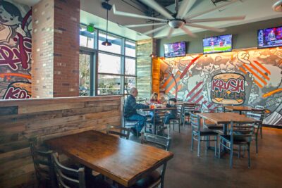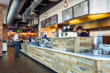 The new 2,600 square foot restaurant is located on the first floor of the California State Lottery Headquarters building and serves burgers, draft beer and Starbuck’s coffee. The space seats 68 people and features industrial-style architecture with open ceilings, exposed duct work, large screen TV’s, a unique large fan, custom graphics and the reclaimed wood crate finishes that make for a warm, exciting place to diner.