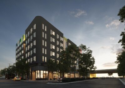 This mixed-use affordable housing project is located on a prominent “gateway” intersection; 25% of the units are for permanent supportive housing for homeless individuals and families.
