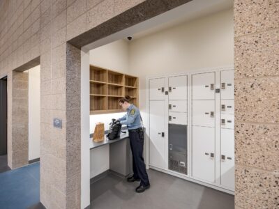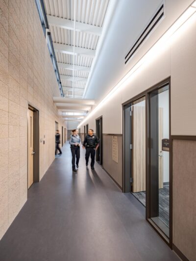 Its objectives include incorporating Equity, Diversity, and Inclusion (EDI) policies and introducing mental health services to support students’ mental well-being. The design prioritizes safety, transparency, collaboration, while maintaining a responsive approach to the surrounding neighborhood and community. The building includes a public lobby, large community engagement room, public and staff restroom facilities, offices, conference room, interview room, evidence and ammunition storage, locker room, and dressing rooms. Secure vehicle and equipment spaces are also included in the project scope.